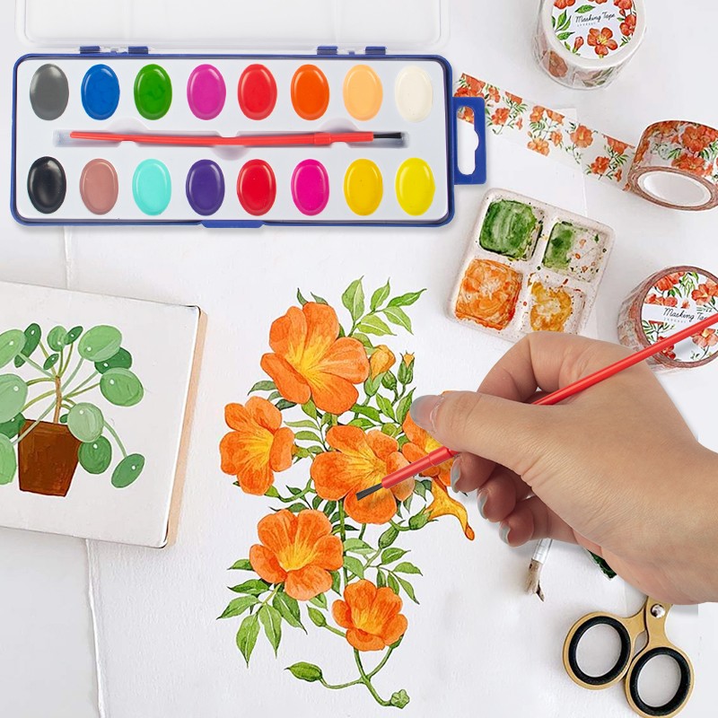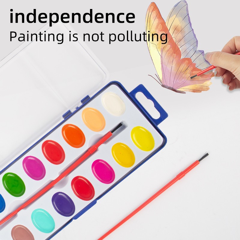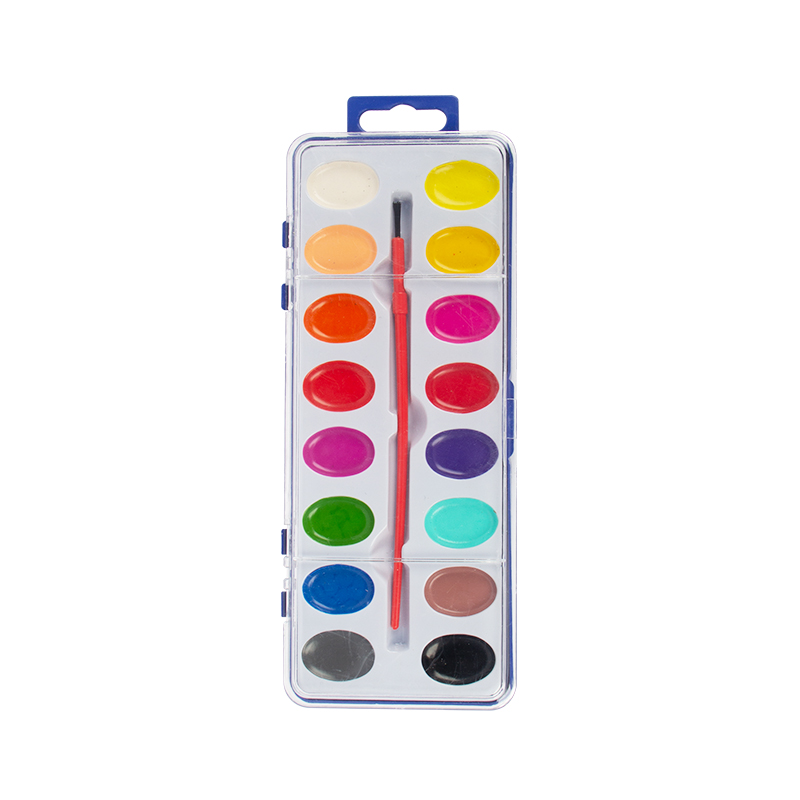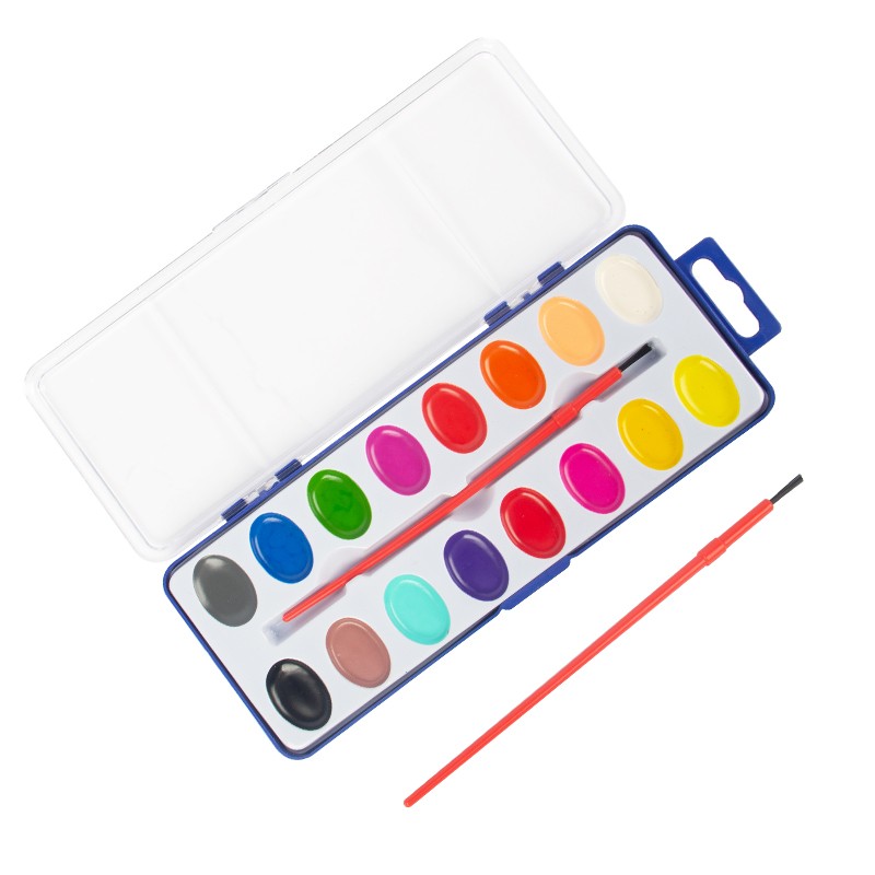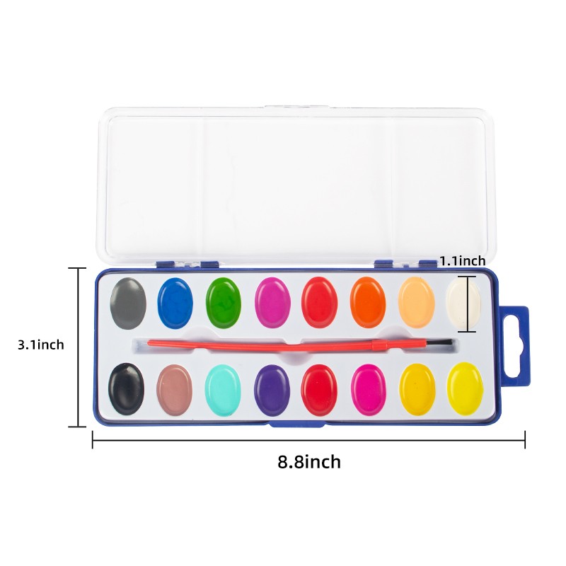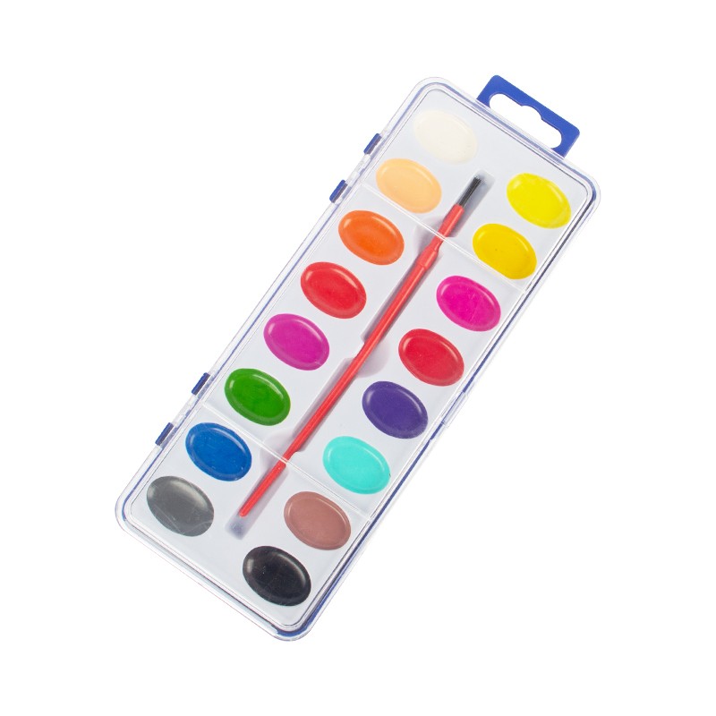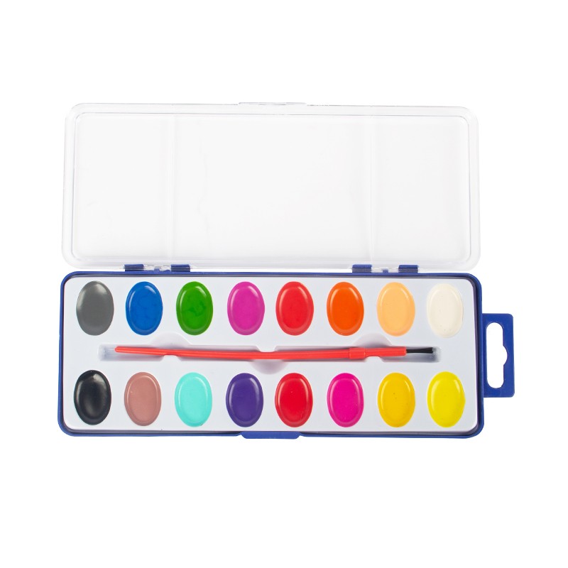 Setiap Set Cat Cat Air 16 Warna dikemas secara individual dalam wadah portabel dengan kuas cat di dalamnya. Hanya dengan sedikit air, Anda bisa mulai melukis. Penutup kotak plastik dapat dilepas, yang dapat berfungsi sebagai palet pencampur.