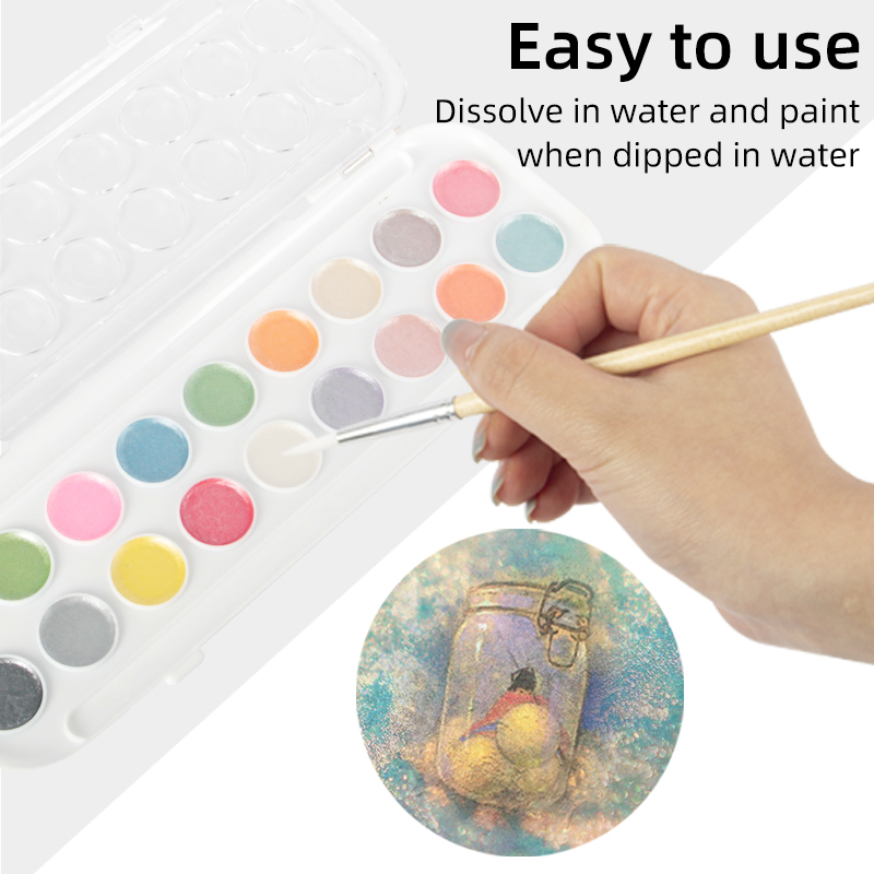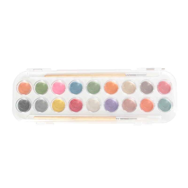 Pabrik kami bangga memproduksi cat air 18 Warna Metalik berkualitas tinggi. Seri warna metalik cat air berkilau menawarkan 28 pigmen murni dan ekstra halus yang terkenal karena transparansi, difusi, tahan luntur cahaya, dan saturasinya yang luar biasa. Hal ini menjadikannya ideal untuk pencampuran dan pencampuran yang mulus dalam upaya artistik.